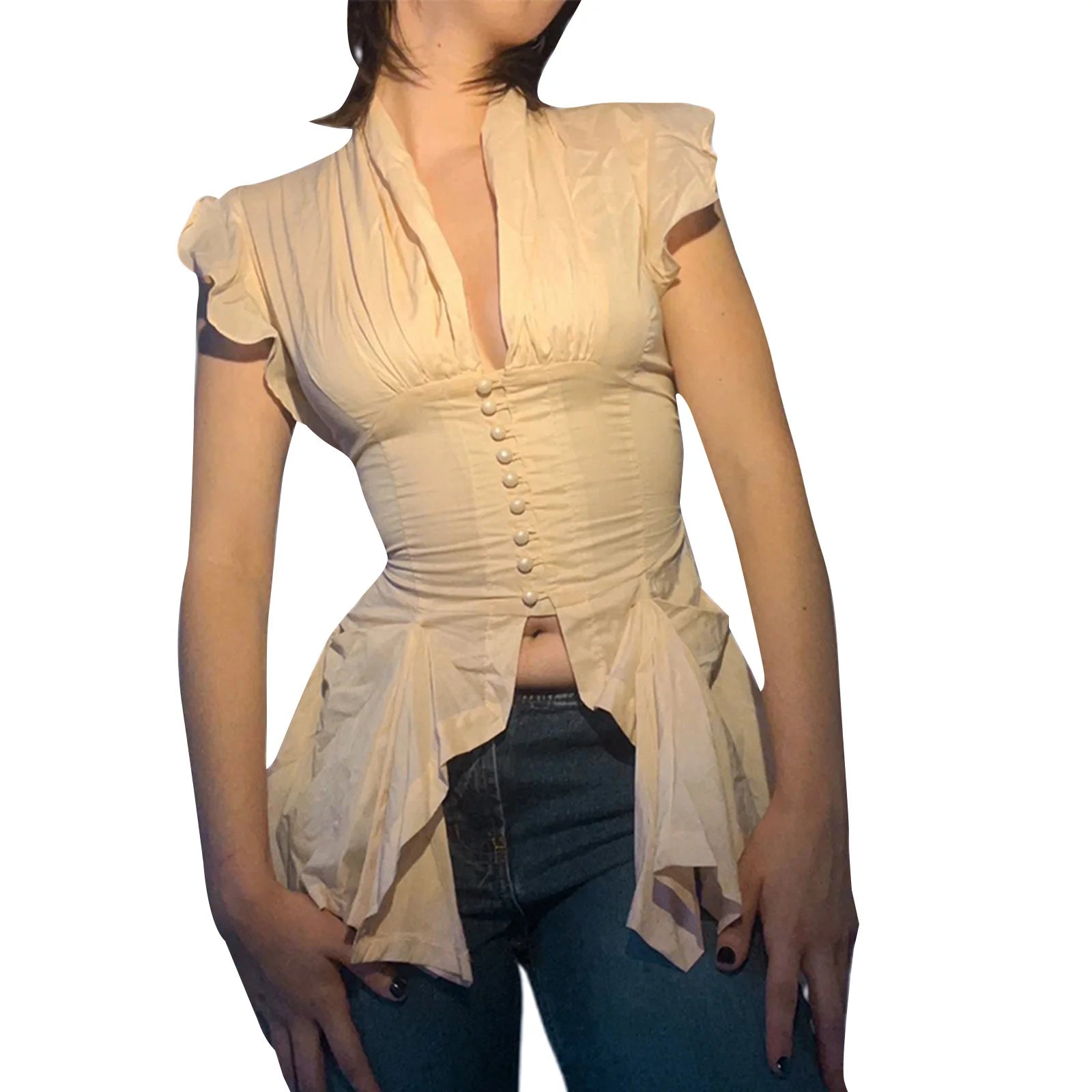 The sleek ruffle design adds a touch of femininity, making it perfect for a variety of occasions—from casual outings to more formal events. The button-down detail enhances its charm, while the split hem provides a modern silhouette that flatters any figure.