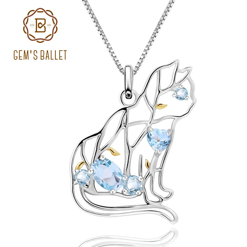 Embrace the elegance and charm of the GEM'S BALLET Cat Shape Natural Sky Blue Topaz Animal Jewelry 925 Sterling Silver Handmade Gemstone Pendant Necklace for Women. This exquisite piece of jewelry is a stunning addition to any collection, perfect for those who appreciate the beauty of nature and artistry.