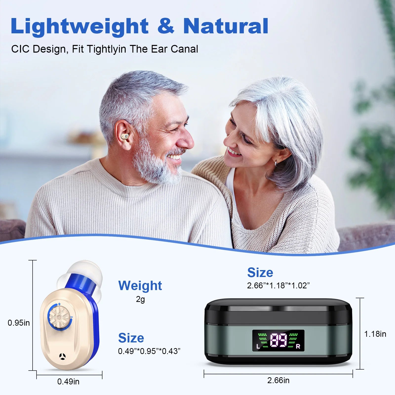 - In-Ear Invisible Design: Compact and comfortable, these hearing aids are discreetly designed to fit seamlessly in your ears, allowing you to enjoy conversations without feeling self-conscious.