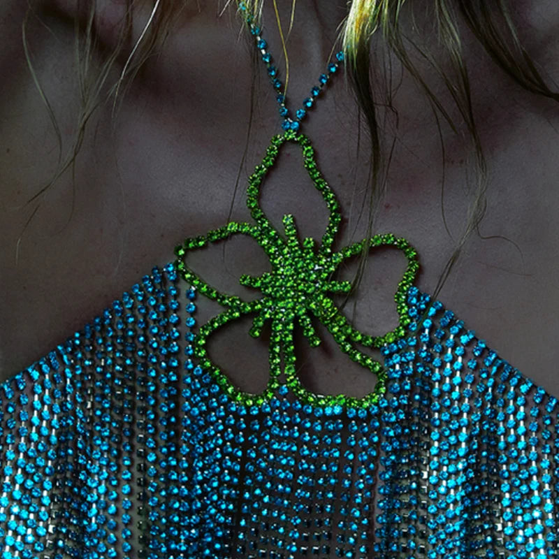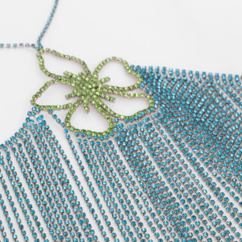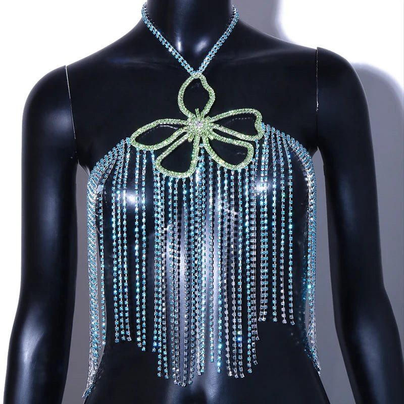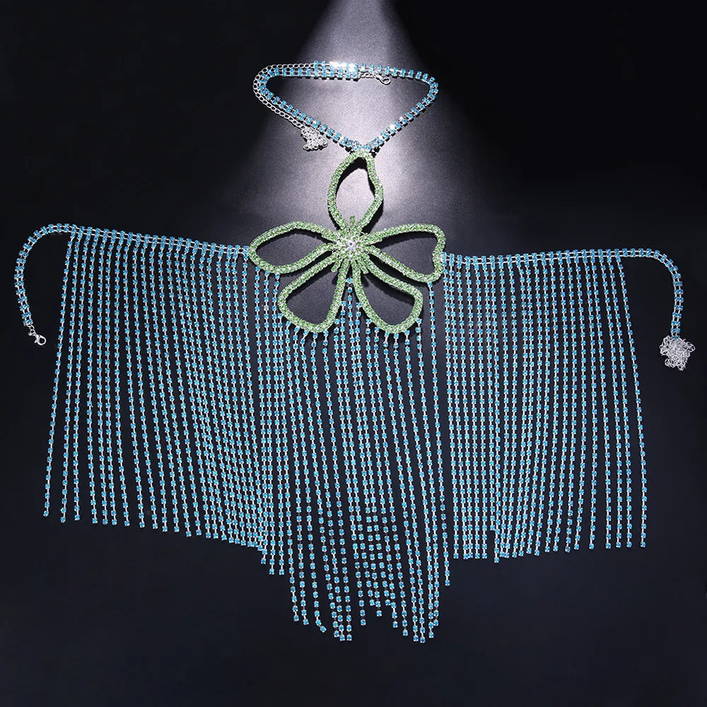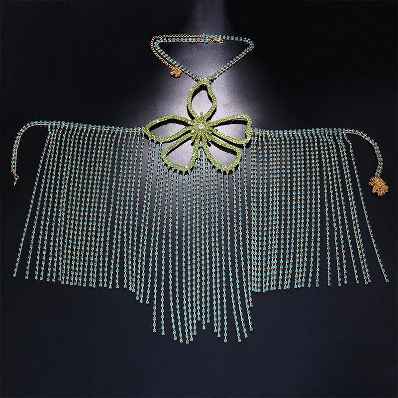 This luxurious tassel flower chest chain is not just an accessory; it's a statement piece that radiates confidence and charm. Stand out at any event, from beach gatherings to glamorous nightclubs. Make heads turn with the Stonefans Green Fringed Flower Bralette and elevate your summer style.