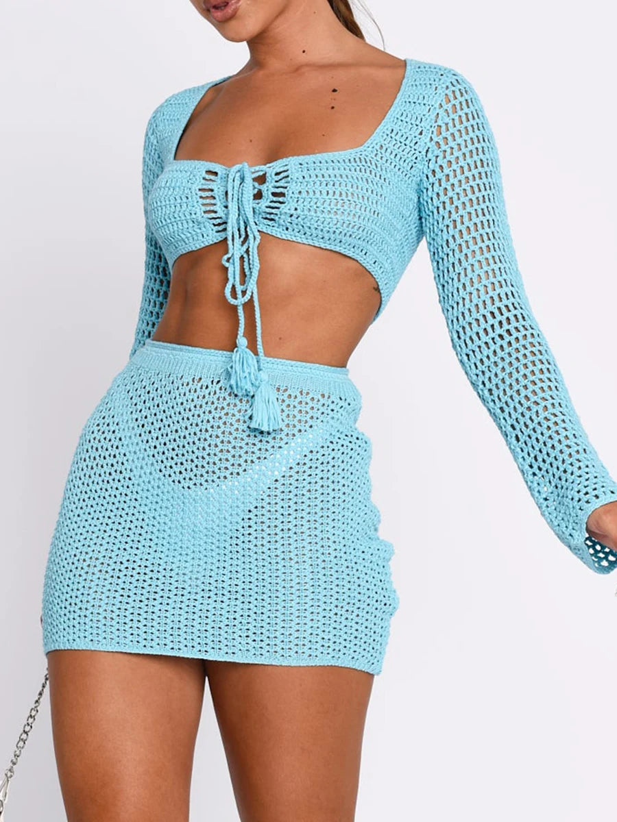 Elevate your summer wardrobe with our Women 2 Pieces Beachwear Outfits, featuring a stylish Square Neck, Long Sleeve design, and a chic Tie-Up Front knitted cover-up complemented by an elegant sarong mini skirt. Perfect for sun-soaked days by the beach or lounging poolside, this ensemble combines comfort, style, and versatility.