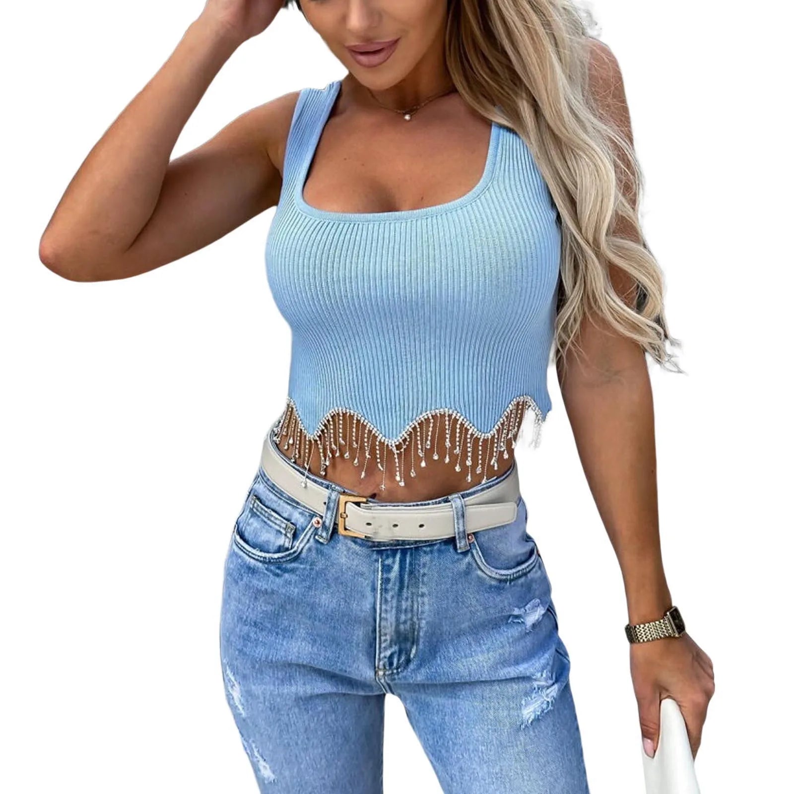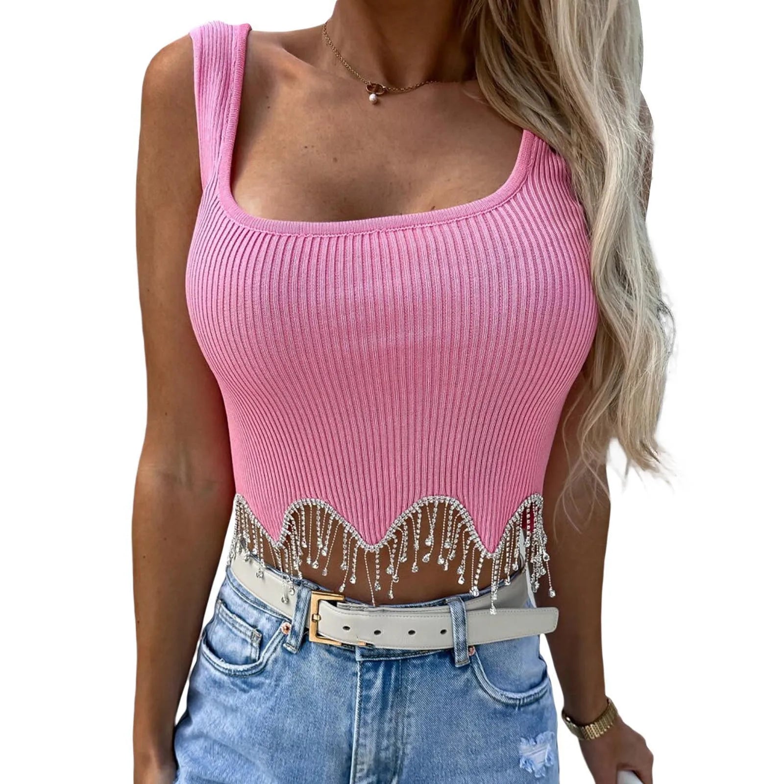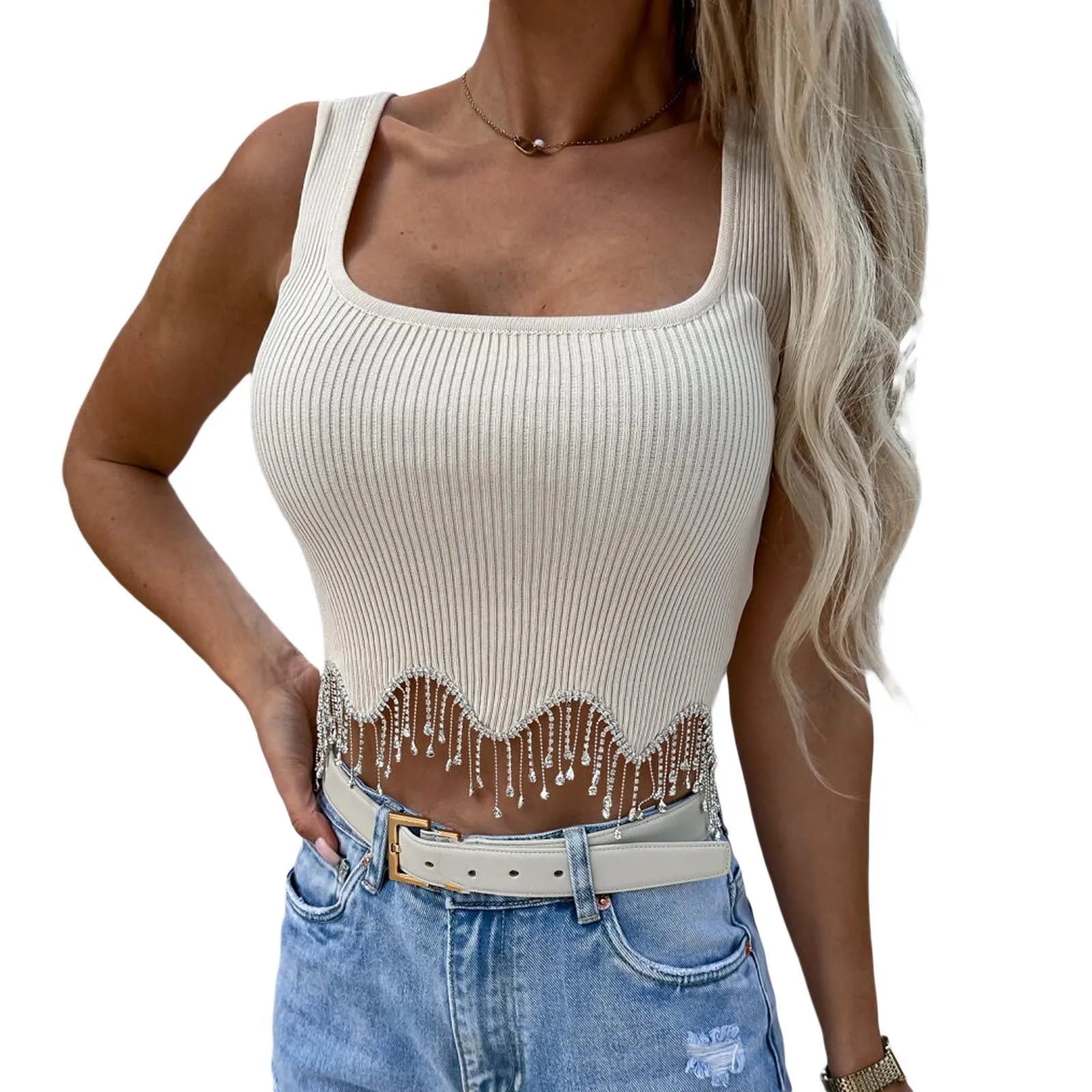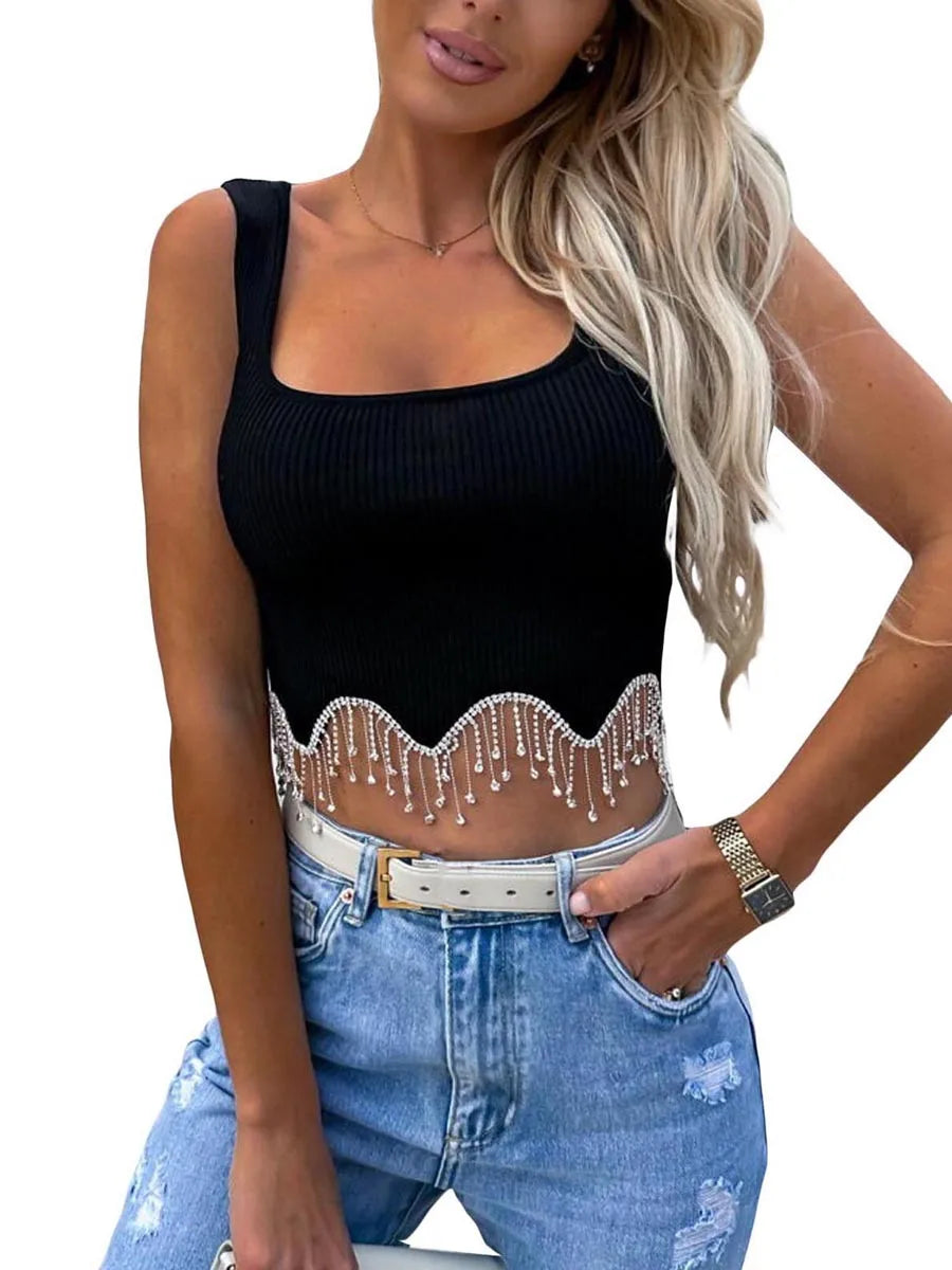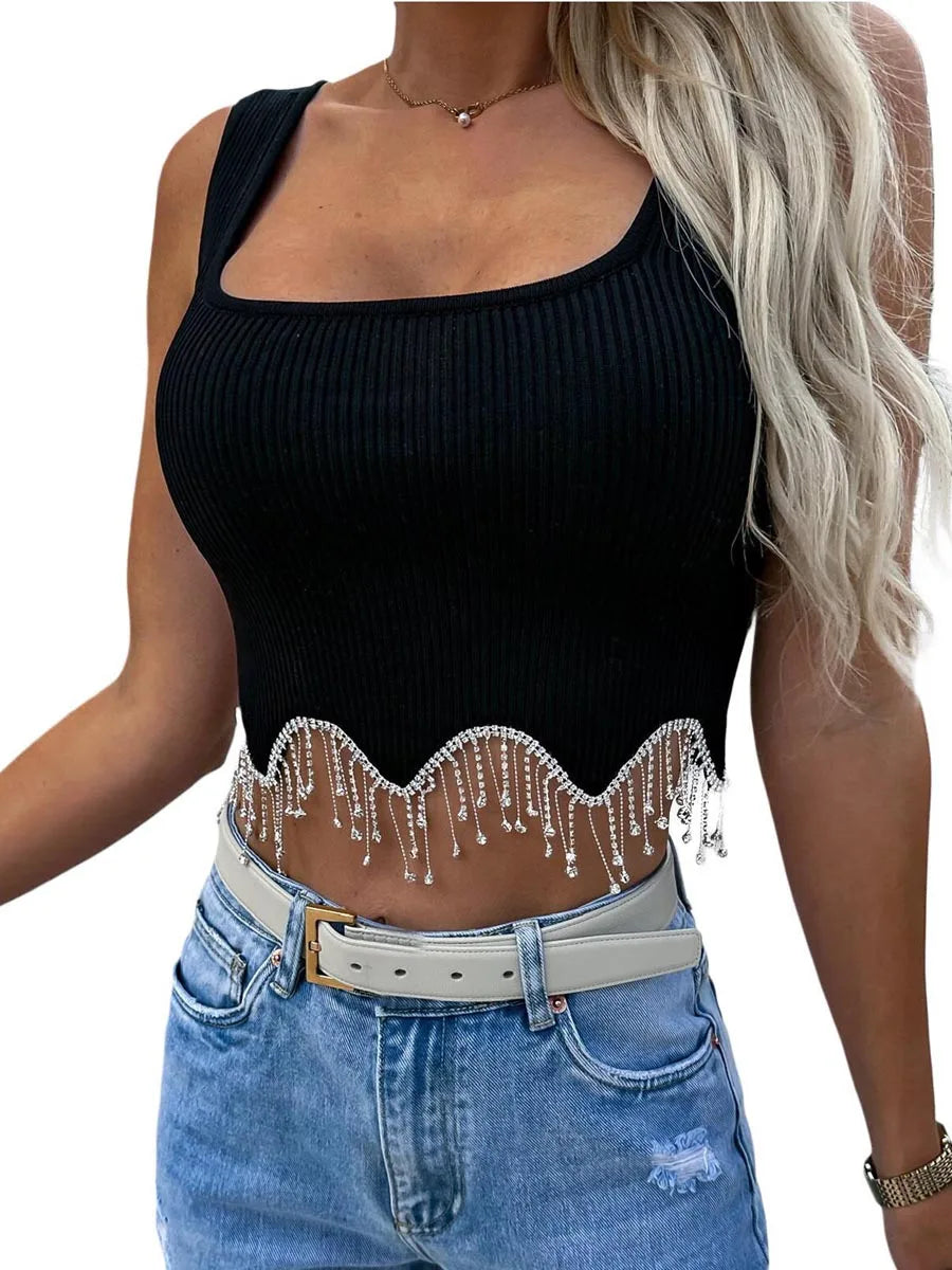 Women Camisole Sleeveless Square Neck Tasseled Rhinestones Fit Summer Tops