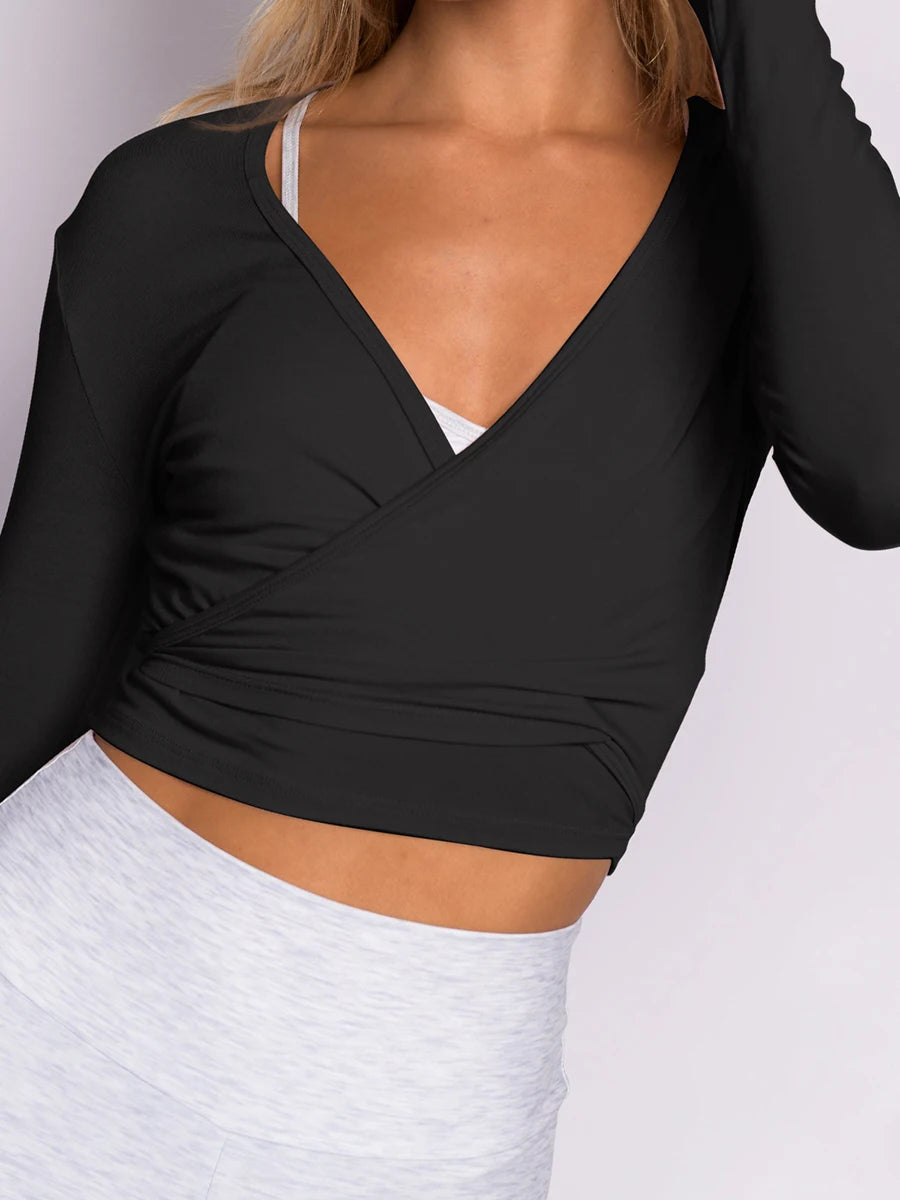 Elevate your workout wardrobe with our Women’s Ballet Wrap Tops Solid Stylish V Neck Long Sleeve Workout T-Shirt, designed specifically for yoga and Pilates practice. This versatile top combines functionality with style, making it a must-have for any fitness enthusiast.