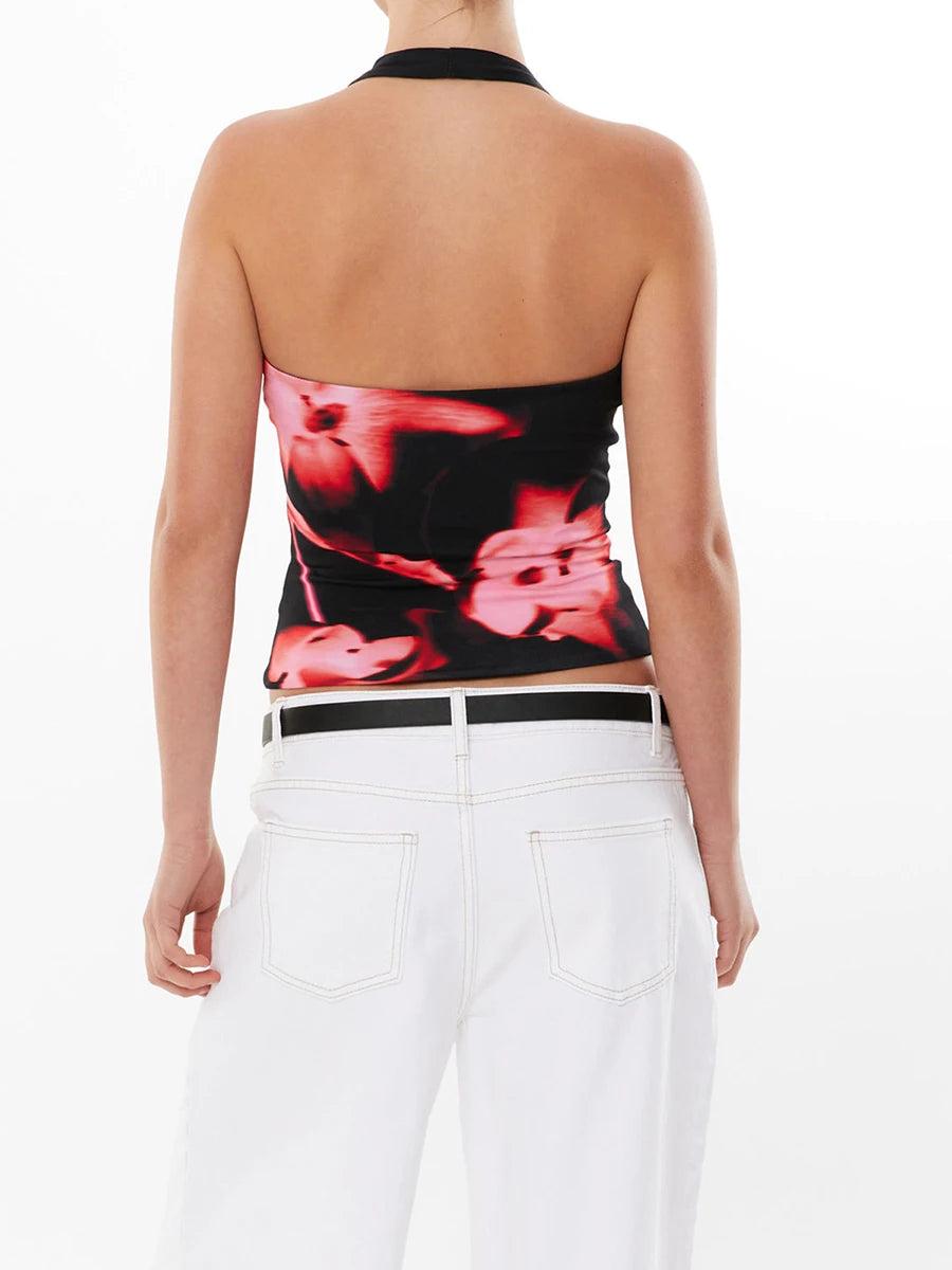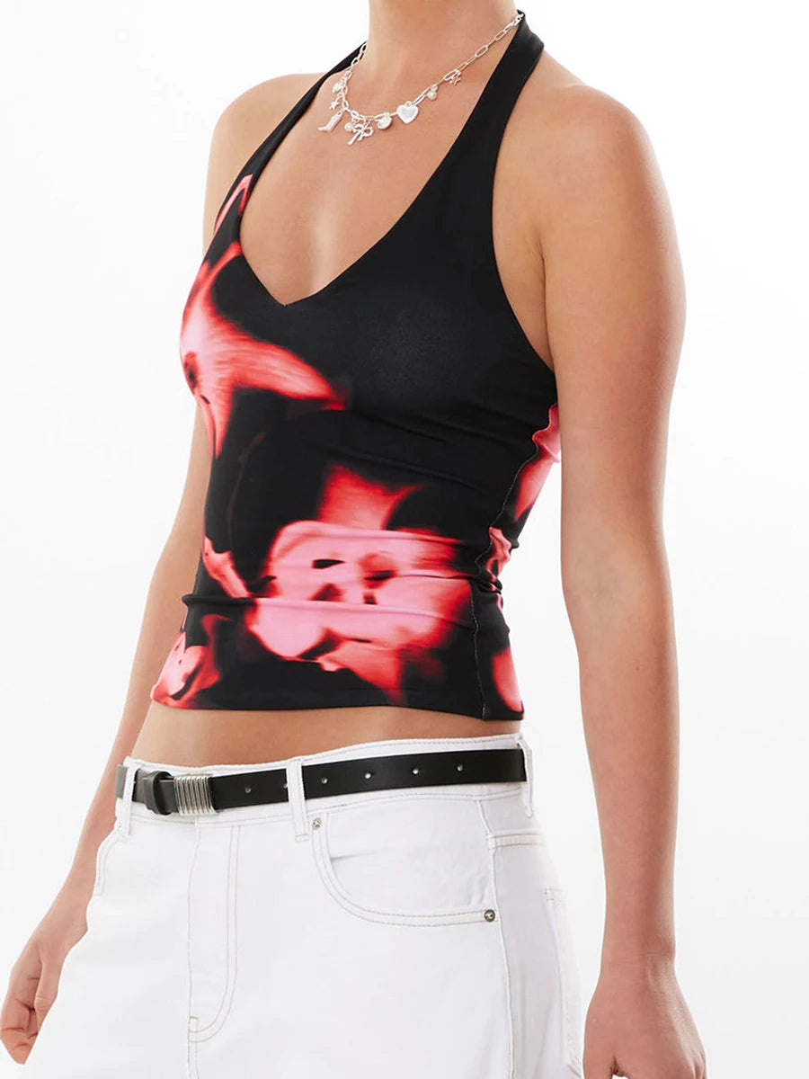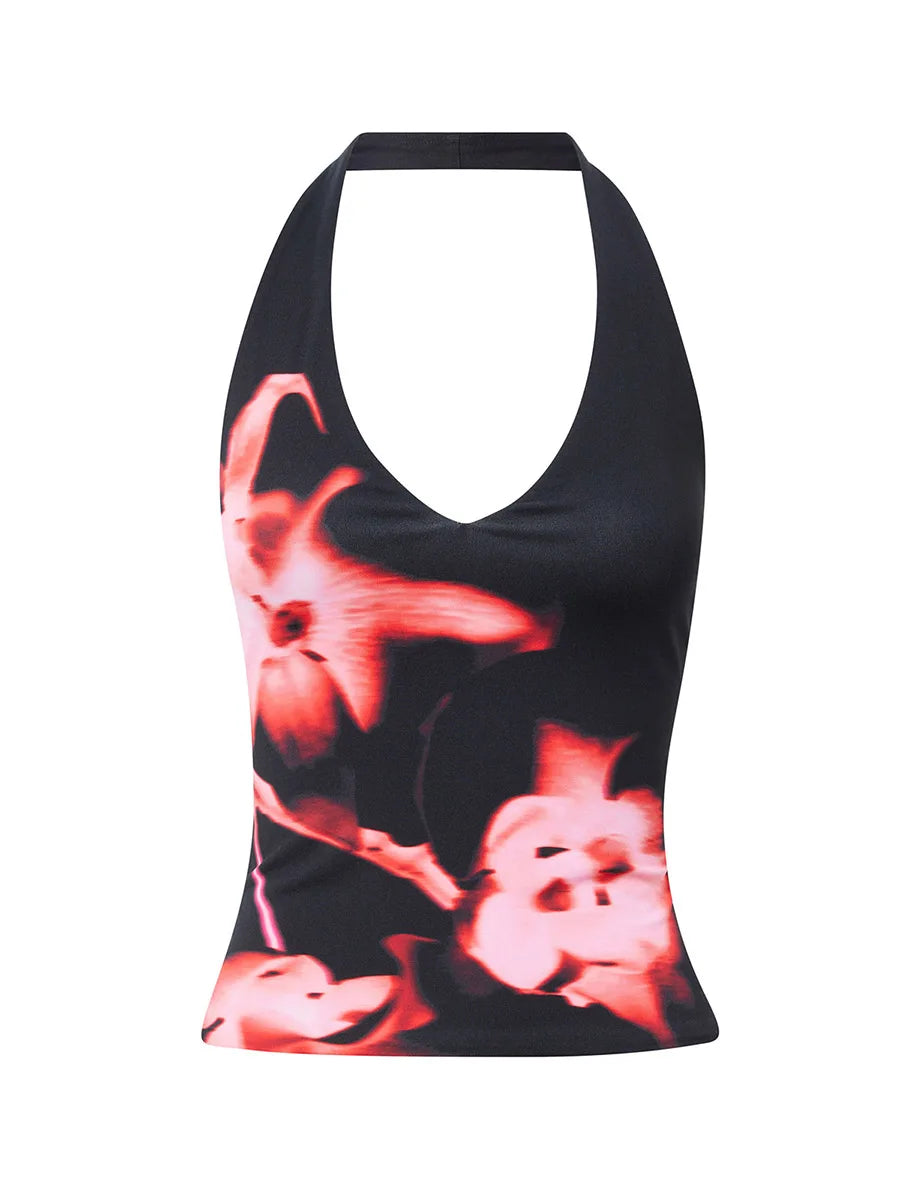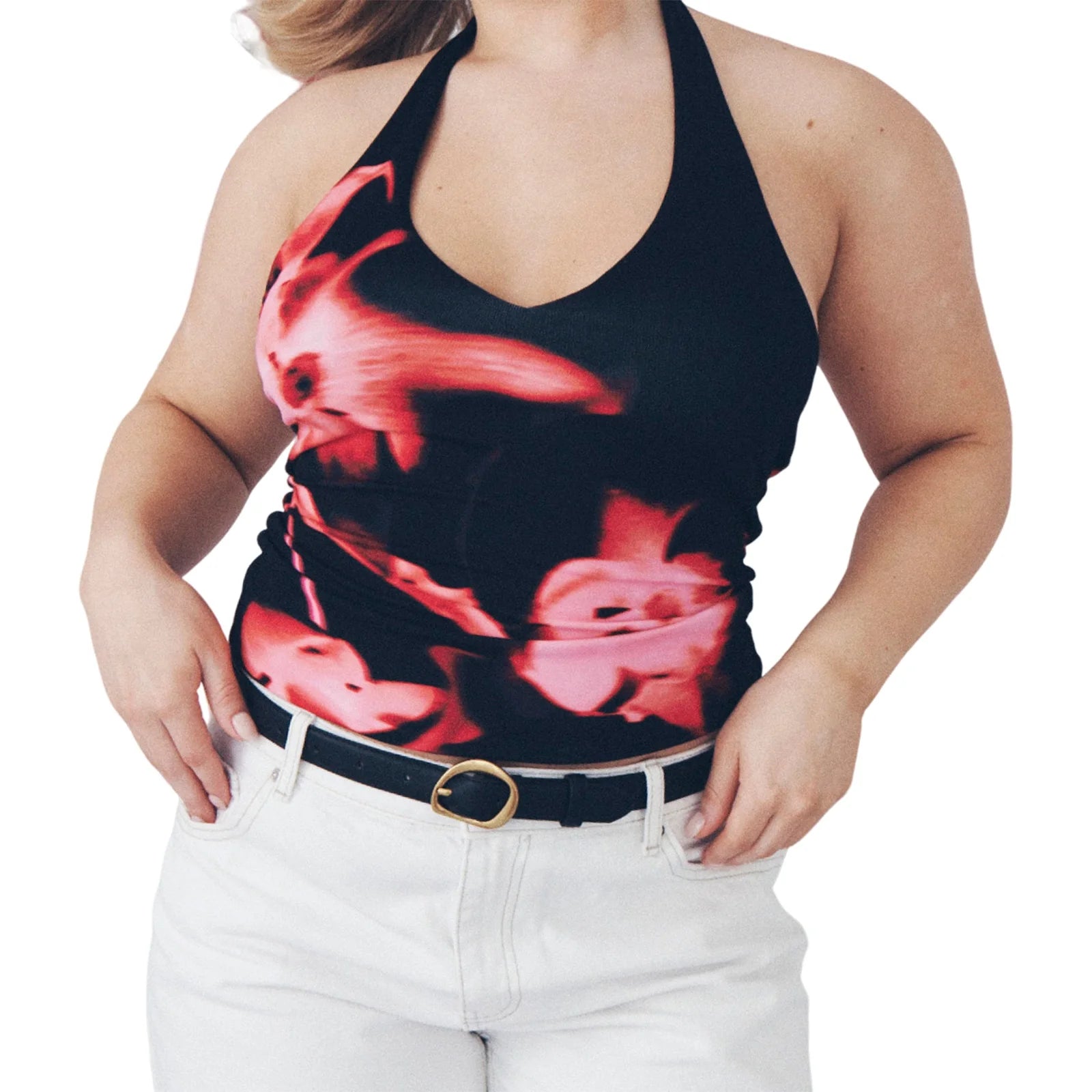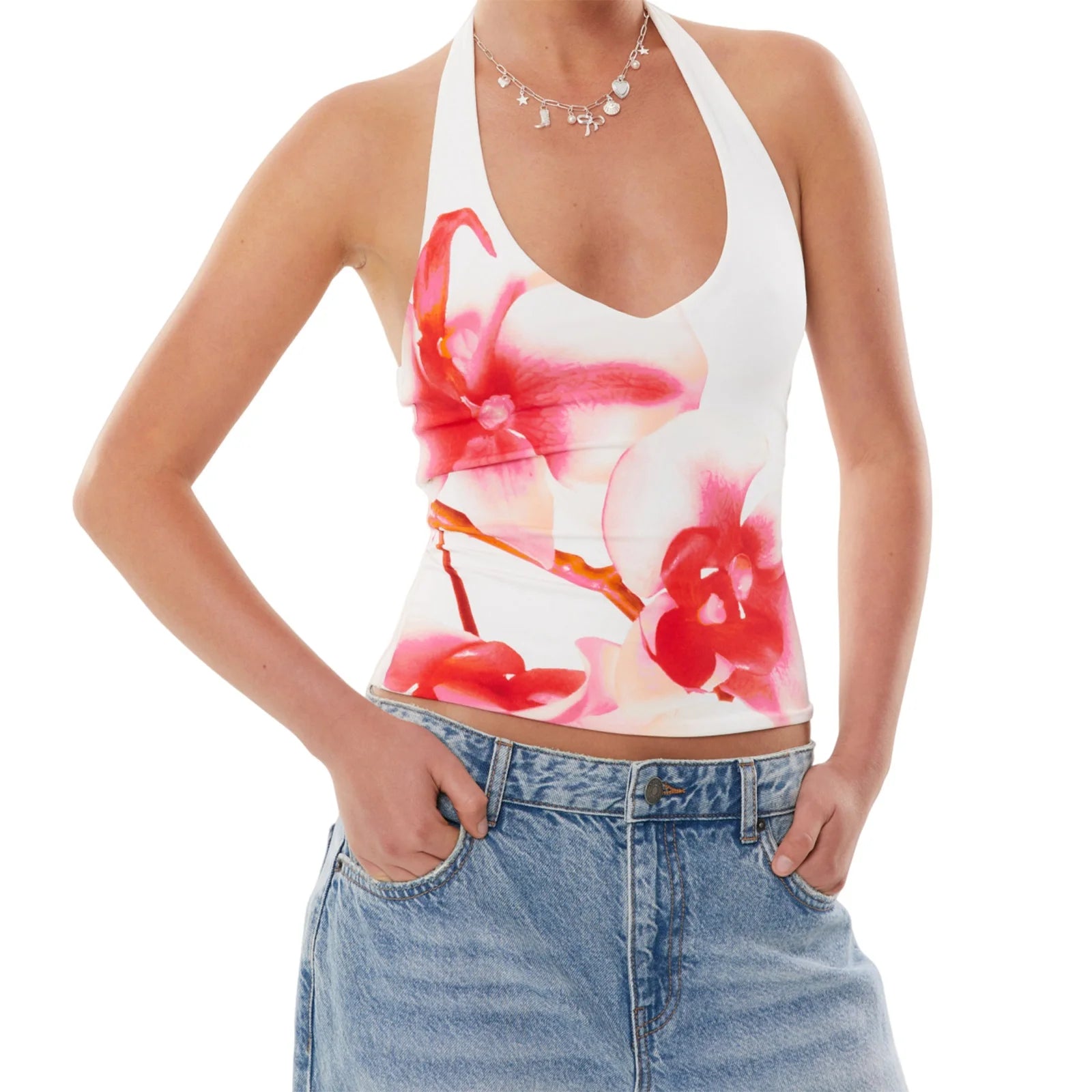 Crafted from 100% high-quality polyester, this crop top features a beautiful floral print that adds a touch of femininity and flair. The lightweight fabric ensures breathability, while the spaghetti straps and halter neck design enhance your silhouette, making this top ideal for warm days and nights out.