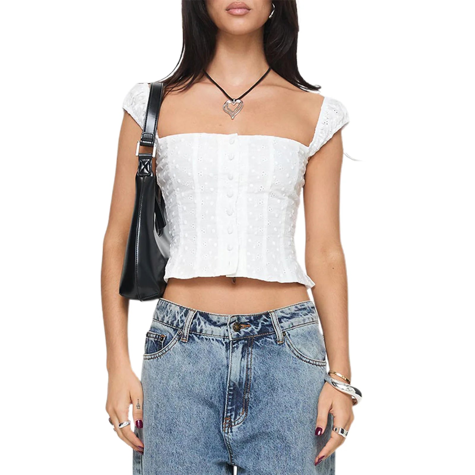Crafted from high-quality 100% polyester, this blouse showcases exquisite floral lace detailing and a flattering square neckline that highlights your collarbone beautifully. The button front adds a touch of elegance, while the smocked back ensures a perfect fit, allowing you to move freely throughout your day.