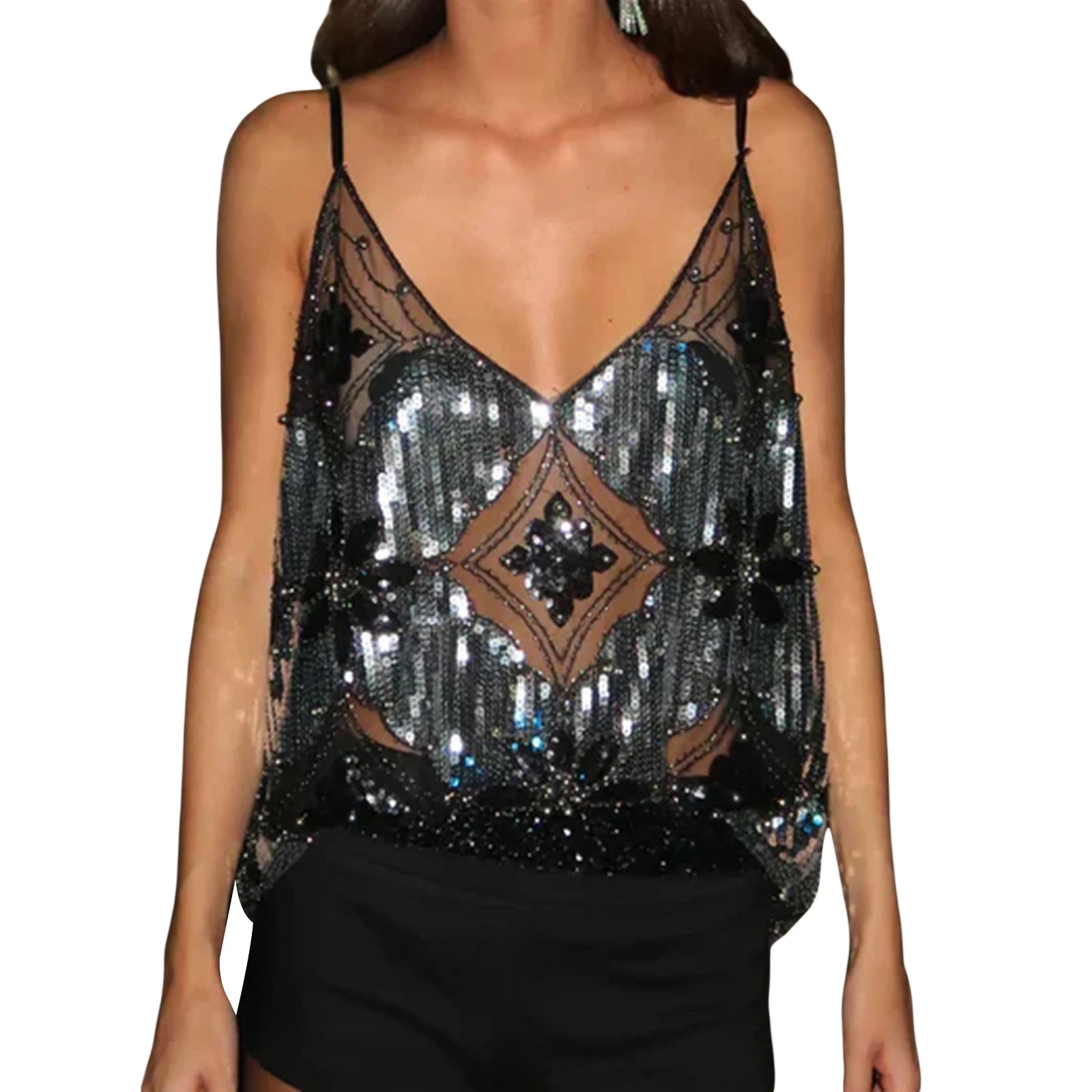 Women s Sparkling Sequin Embellished Crop Top Sleeveless V-Neck Fit Camisole Fashion Tank Tops