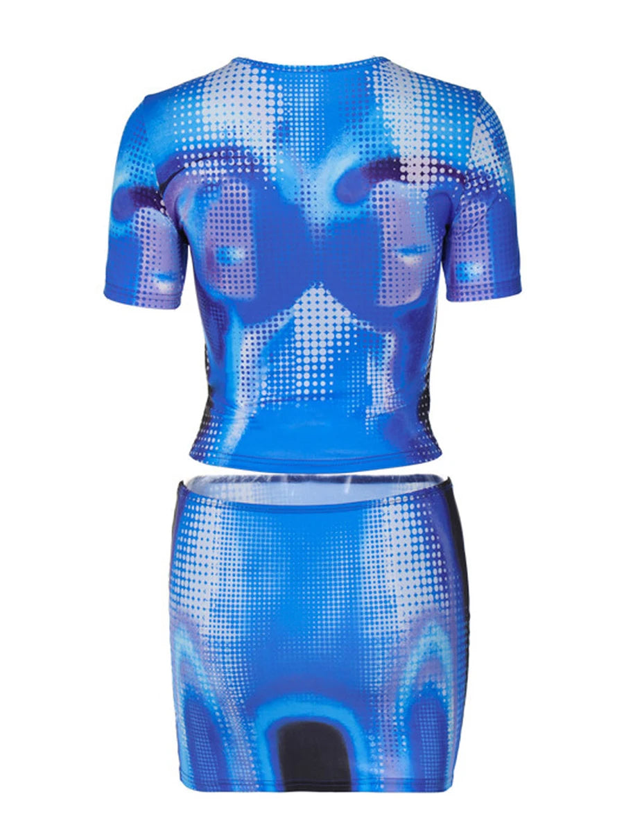 Crafted from a blend of 83% Polyester and 17% Spandex, this outfit ensures a flattering fit while allowing for ease of movement. The short-sleeve T-shirt features a chic tie dye print that adds a splash of color to your look, while the mini bodycon skirt hugs your curves in all the right places.