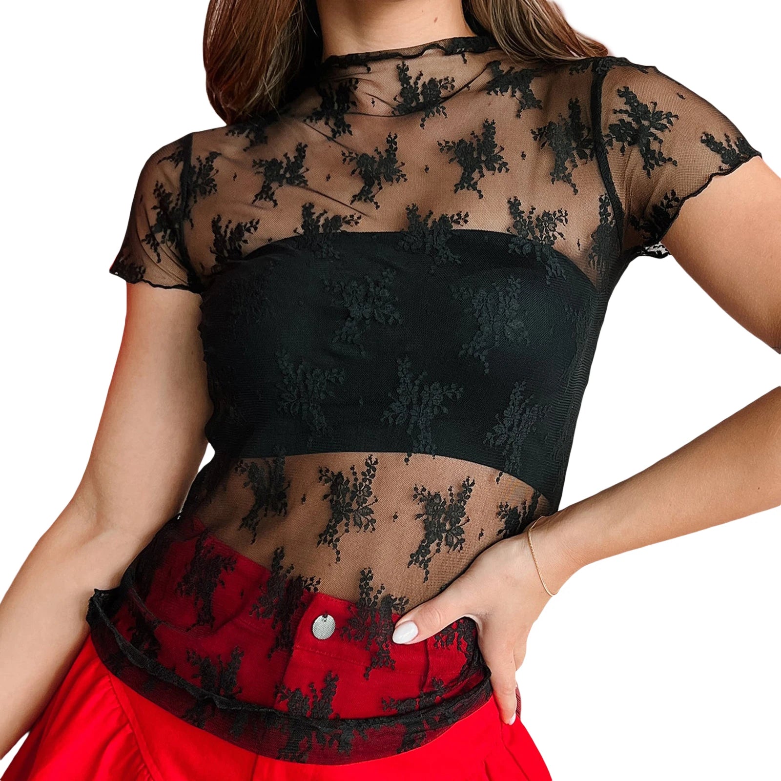 Elevate your summer wardrobe with our Women's Summer Lace Floral Tops Mesh Sheer Short Sleeve Mock Neck Fit T-Shirt. Crafted with a delicate lace pattern and soft polyester fabric, this chic top combines style and comfort for any occasion.