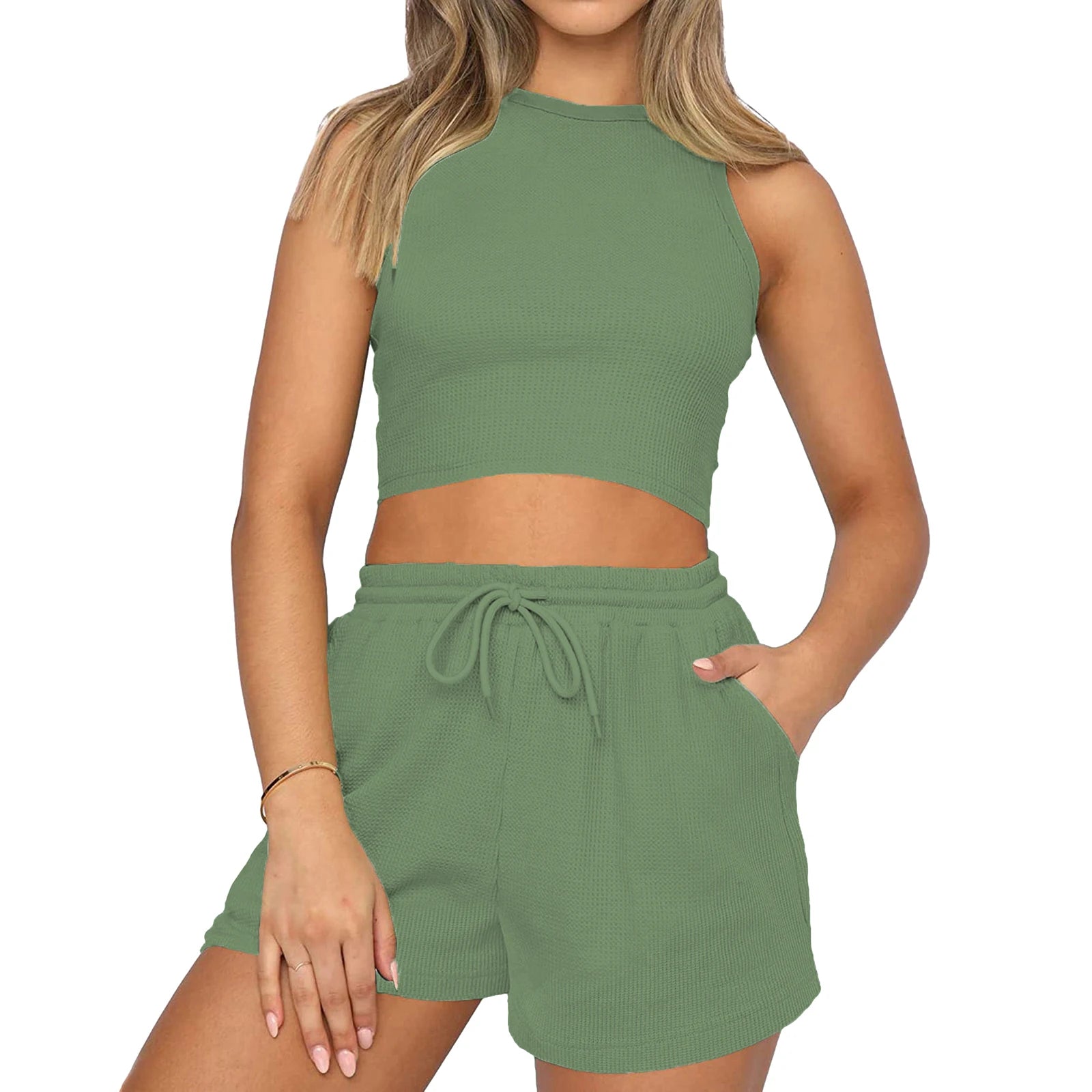 Women’s Two Piece Summer Outfit Sleeveless Waffle Tank Top and Shorts Set Loungewear
