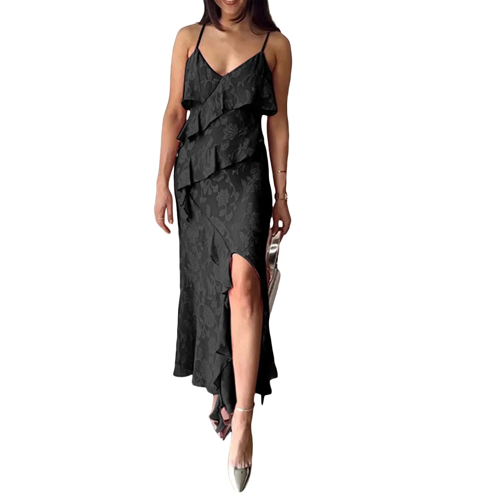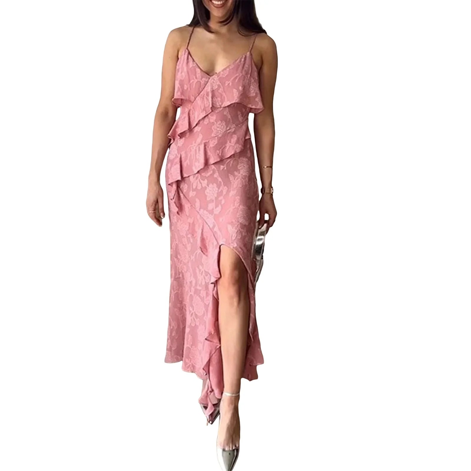 Women Summer Ruffled Floral Jacquard V-Neck Sleeveless Split Party Dress for Cocktail Beach Streetwear