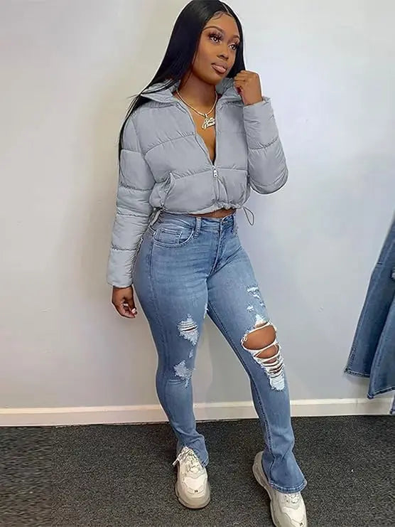 Women's Winter Cropped Puffer Jacket Long Sleeve Full Zip